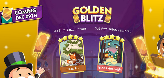 The designated gold stickers for Monopoly Go Golden Blitz event would go on sale on IGGM on December 9th, called "Set17 - Frosty Fox, Set22 - To All A Goodnight".