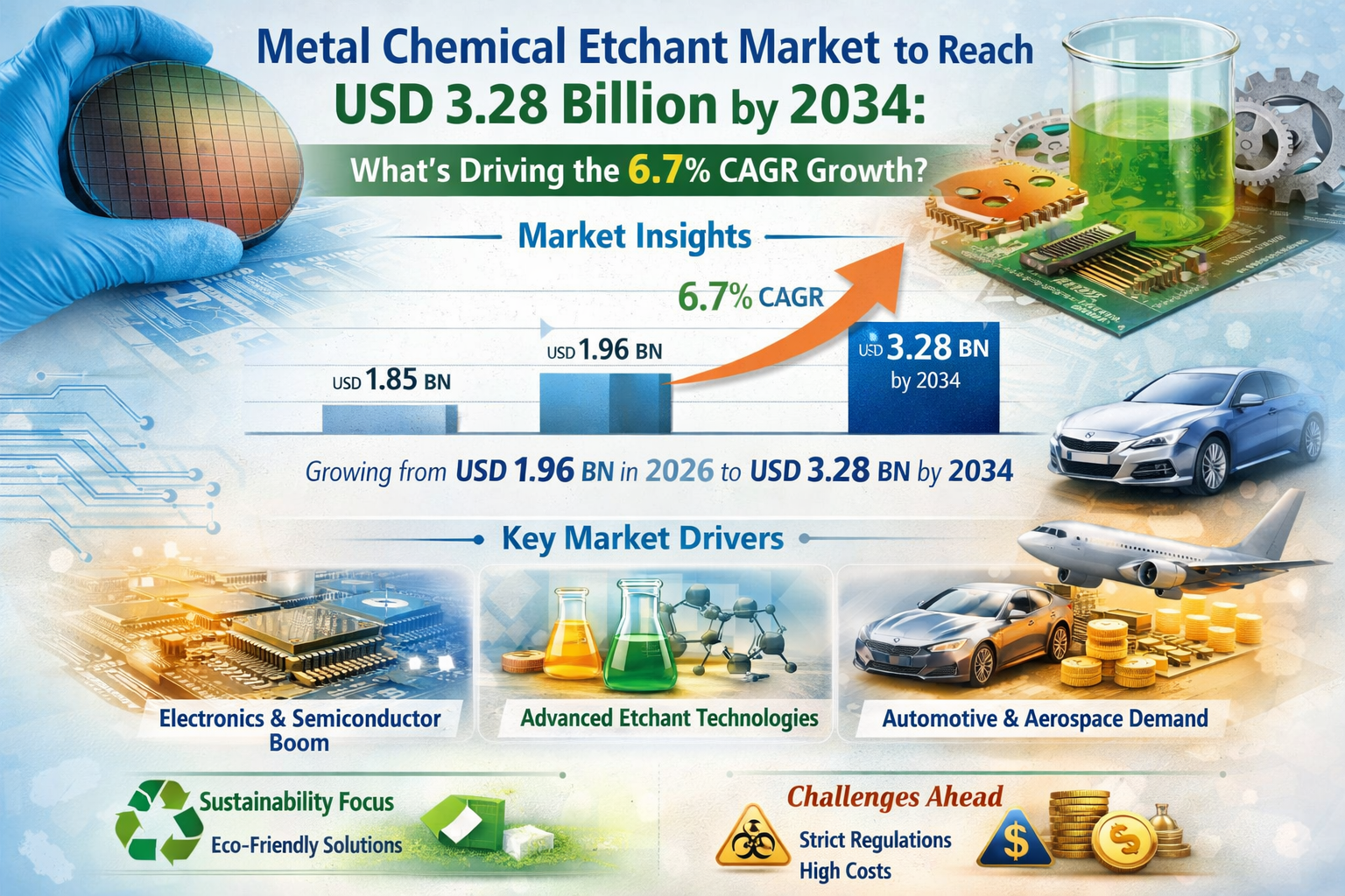 Global Metal Chemical Etchant market was valued at USD 1.85 billion in 2025 and is projected to reach USD 3.28 billion by 2034, exhibiting a compound annual growth rate (CAGR) of 6.7% during the forecast period.