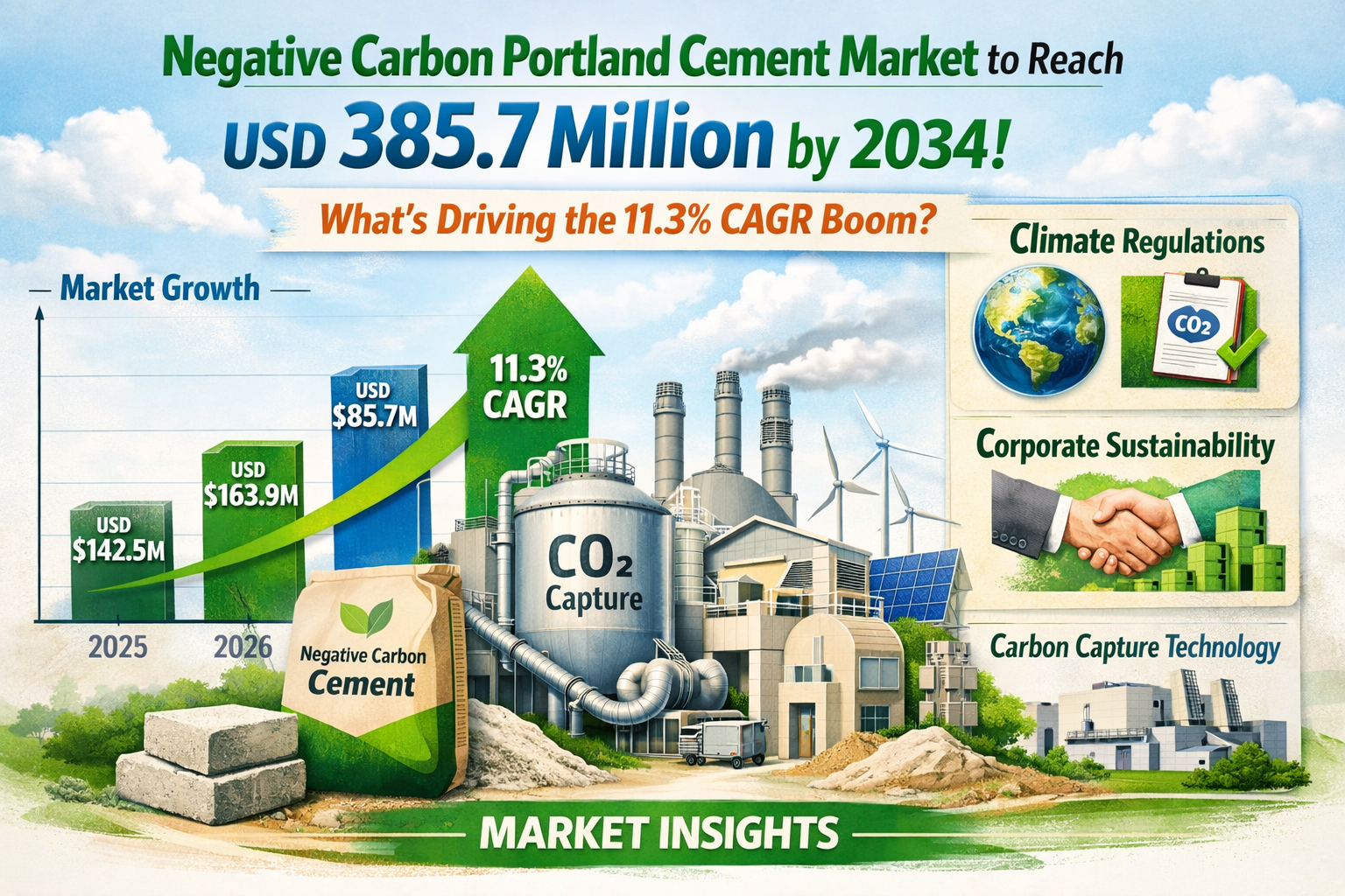 Global Negative Carbon Portland Cement market was valued at USD 142.5 million in 2025 and is projected to reach USD 385.7 million by 2034, exhibiting a compound annual growth rate (CAGR) of 11.3% during the forecast period.