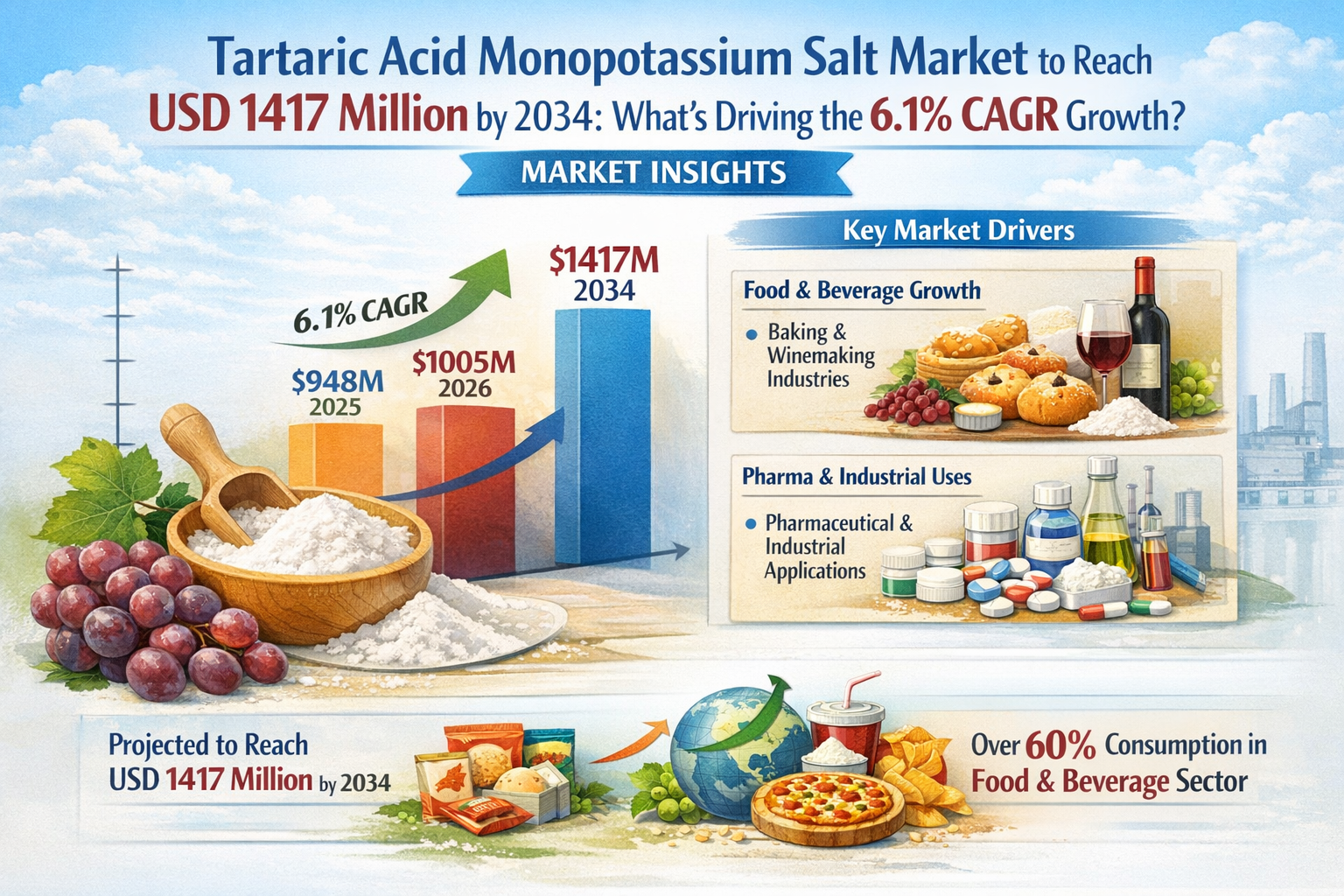 Global Tartaric Acid Monopotassium Salt market was valued at USD 948 million in 2025 and is projected to reach USD 1417 million by 2034, exhibiting a steady CAGR of 6.1% during the forecast period.