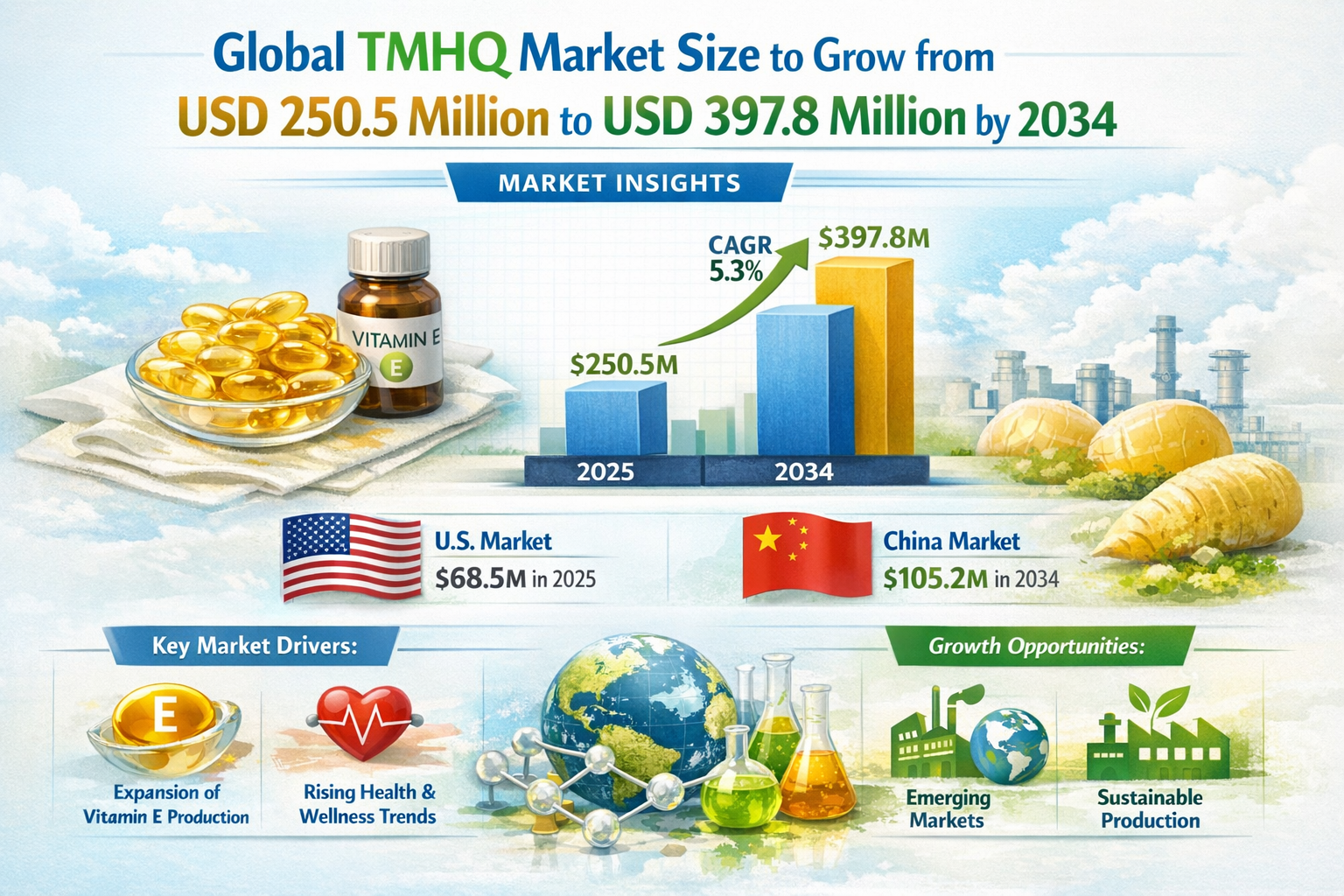 Global Trimethylhydroquinone (TMHQ) market was valued at USD 250.5 million in 2025 and is projected to reach USD 397.8 million by 2034, exhibiting a steady CAGR of 5.3% during the forecast period. The U.S. market is estimated at USD 68.5 million in 2025, while the Chinese market is projected to reach USD 105.2 million by 2034.