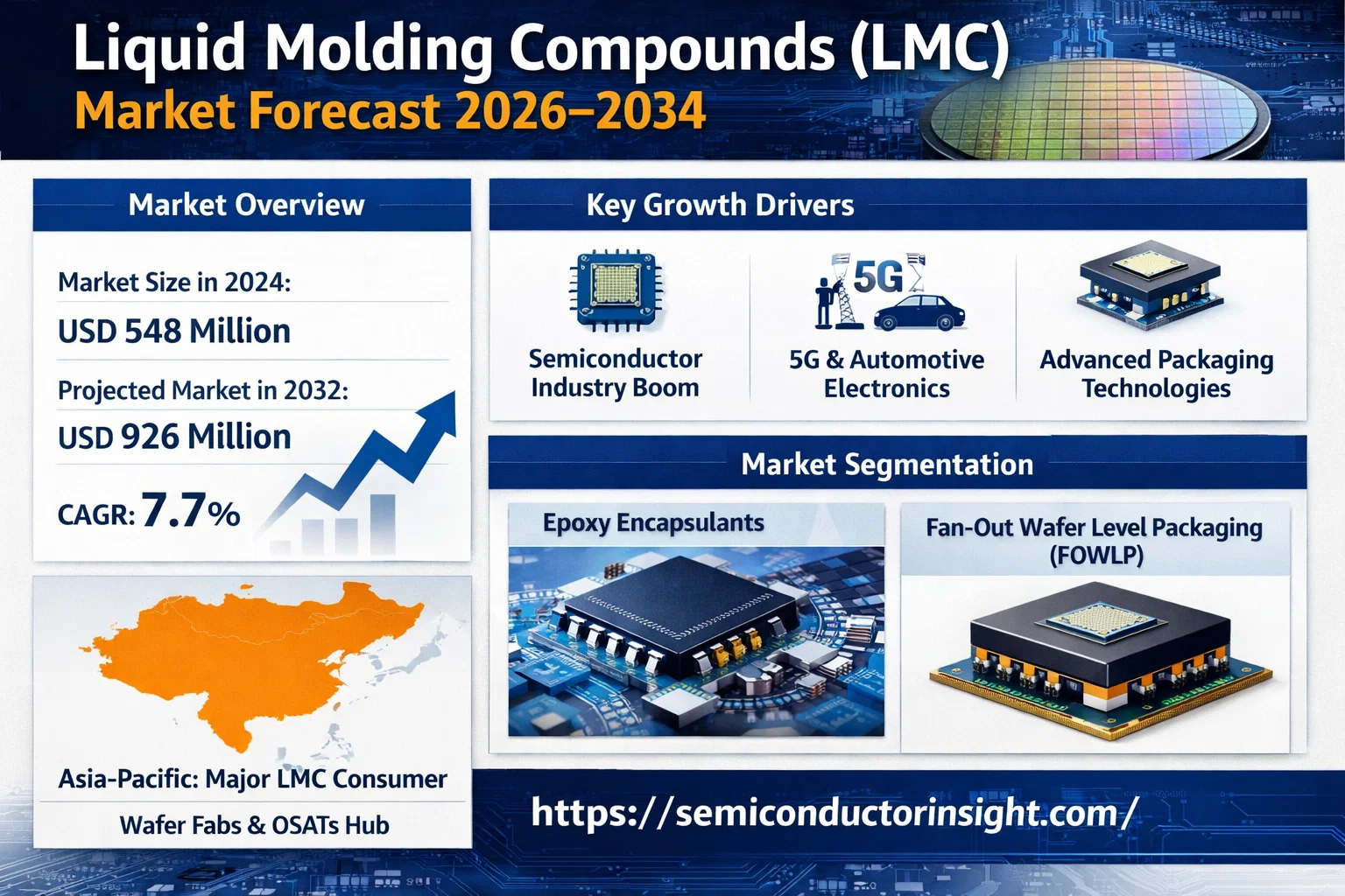 global Liquid Molding Compounds (LMC) Market, valued at a robust USD 548 million in 2024, is on a trajectory of significant expansion, projected to reach USD 926 million by 2032. This growth, representing a compound annual growth rate (CAGR) of 7.7%, is detailed in a comprehensive new report published by Semiconductor Insight. The study highlights the critical role of these advanced materials in ensuring reliability, thermal management, and miniaturization within semiconductor packaging, particularly for high-performance computing, automotive electronics, and 5G infrastructure.