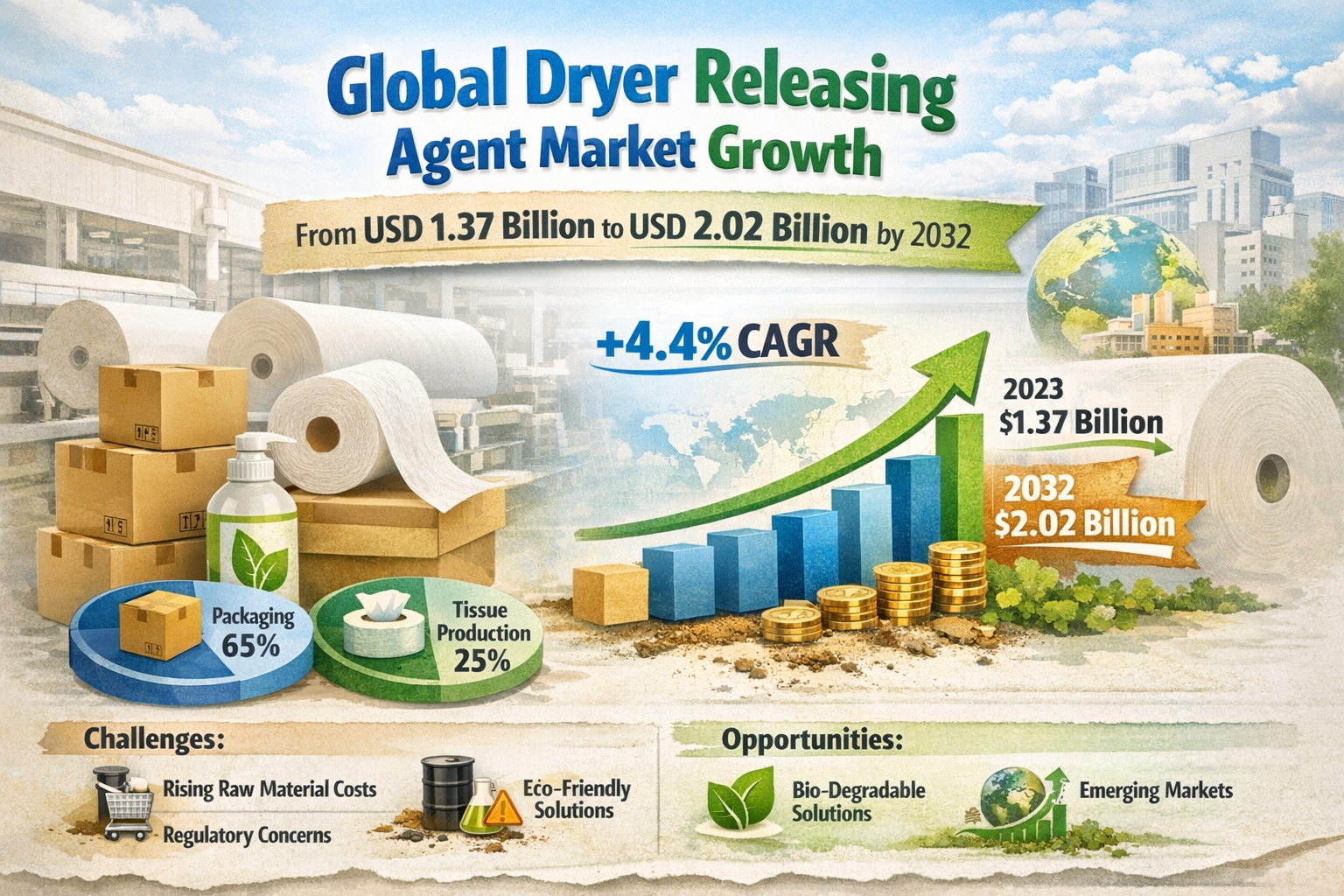 Global Dryer Releasing Agent Market continues to exhibit steady expansion, with its valuation reaching USD 1.37 billion in 2023. According to the latest industry projections, the market is expected to grow at a 4.4% CAGR, reaching approximately USD 2.02 billion by 2032. This sustained growth stems from increasing paper manufacturing activities worldwide, particularly in packaging and tissue production, where dryer releasing agents play a critical role in operational efficiency and product quality.
