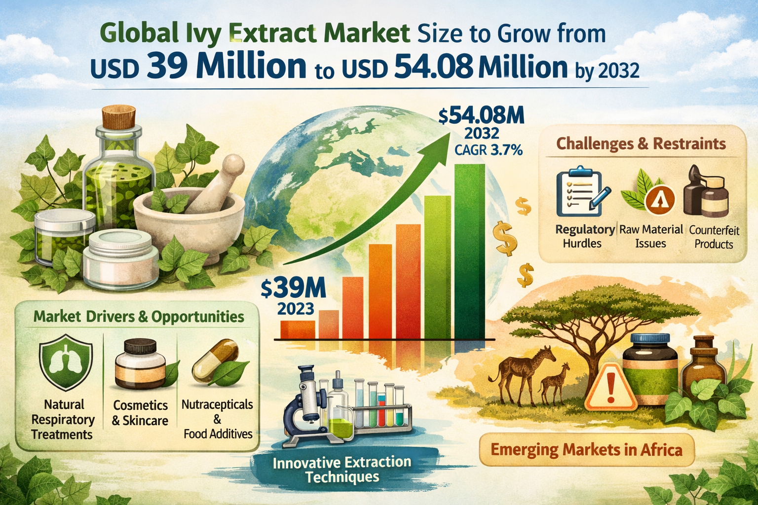 Global Ivy Extract Market is gaining significant traction, with its valuation reaching USD 39 million in 2023 and projected to grow at a CAGR of 3.70% to approximately USD 54.08 million by 2032. This growth is primarily driven by increasing demand in pharmaceutical, cosmetic, and food additive industries, particularly in regions where natural and plant-based solutions are in high demand.