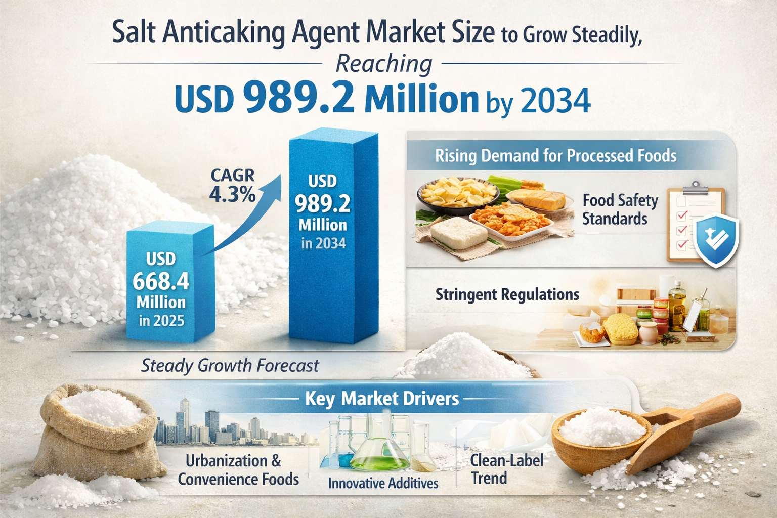 Global salt anticaking agent market was valued at USD 668.4 million in 2025 and is projected to reach USD 989.2 million by 2034, exhibiting a compound annual growth rate (CAGR) of 4.3% during the forecast period.