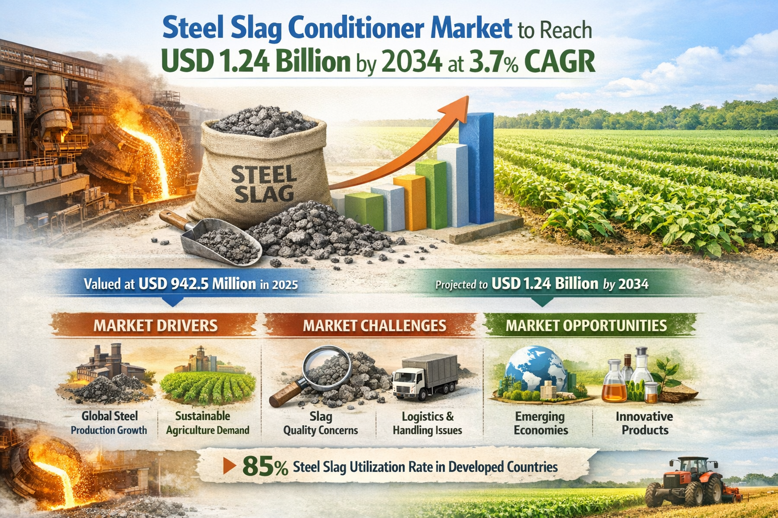 Global Steel Slag Conditioner market was valued at USD 942.5 million in 2025 and is projected to reach USD 1.24 billion by 2034, exhibiting a steady CAGR of 3.7% during the forecast period.