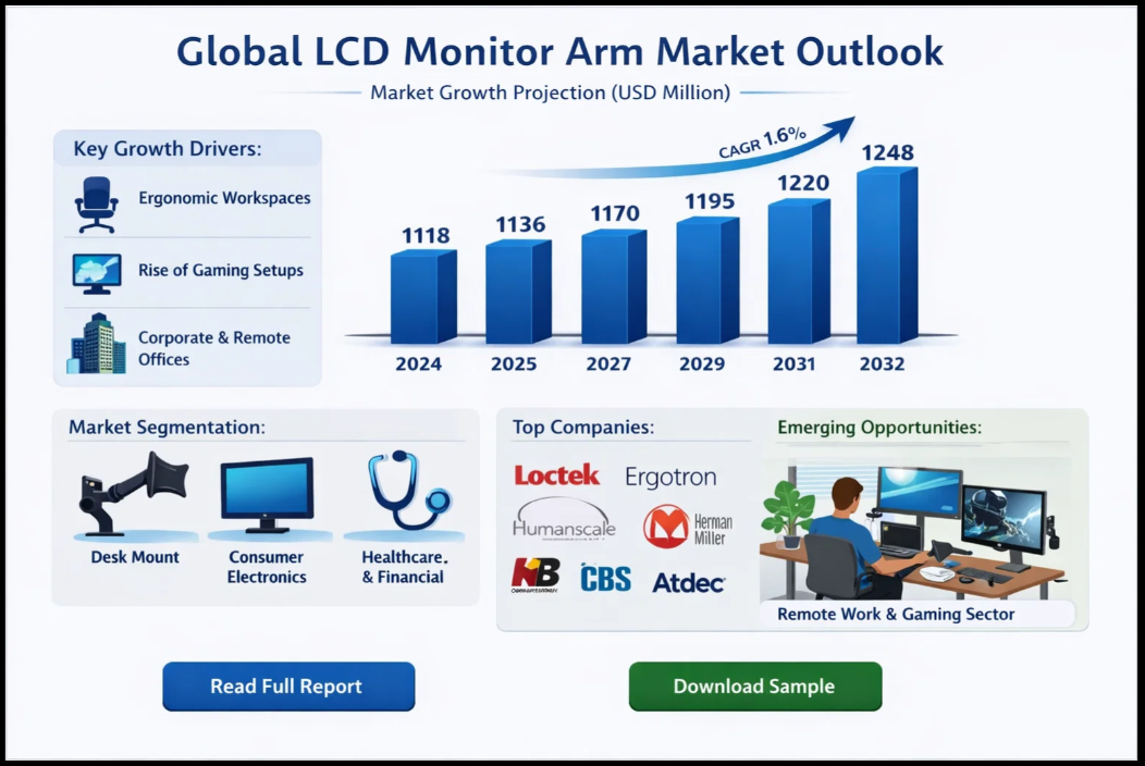 #LCDMonitorArmMarket #ErgonomicWorkspace #OfficeErgonomics #WorkstationSetup #HomeOfficeSetup #GamingSetup #MonitorMount #OfficeFurniture #WorkspaceProductivity #DeskSetup #TechWorkspace #ErgonomicDesign #RemoteWorkTrend #ConsumerElectronics #TechMarketGrowth #GlobalMarket #SemiconductorInsight